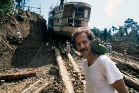 werner herzog and the boat for fitzcaraldo with a bird on his shoulder :)