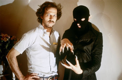 werner herzog with a masked man on set